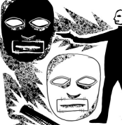 One of the bandits has an intense stare, and a constellation of tattoos across his shaved head. He keeps his arms crossed.