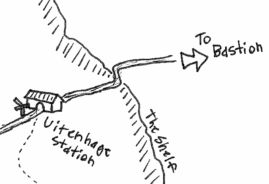 It’s afternoon. The characters walk the poorly-maintained road bisecting the region. A heavy haze obscures a large crowd gathered ahead. They hold long rifles and block the road.