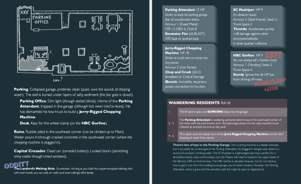 This is my first time designing a multi-page adventure. One of my goals has been to maintain table-usability. Each spread in the pdf is made to be used like a demented control panel the Conductor can use to react to the players.