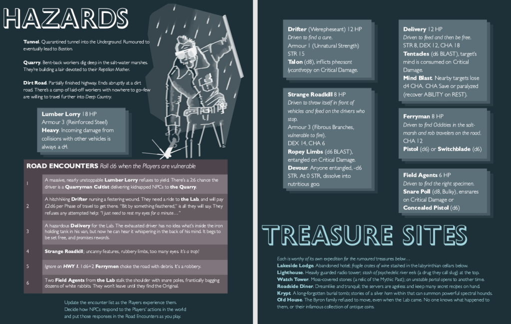 When you commit to scan-ability, you don’t have a lot of room left for detailed descriptions. I tried to be punchy and specific with the treasure sites–hopefully a small side adventure pops into your head as one of the Road Encounters is describing the Lakeside Lodge, or whichever.