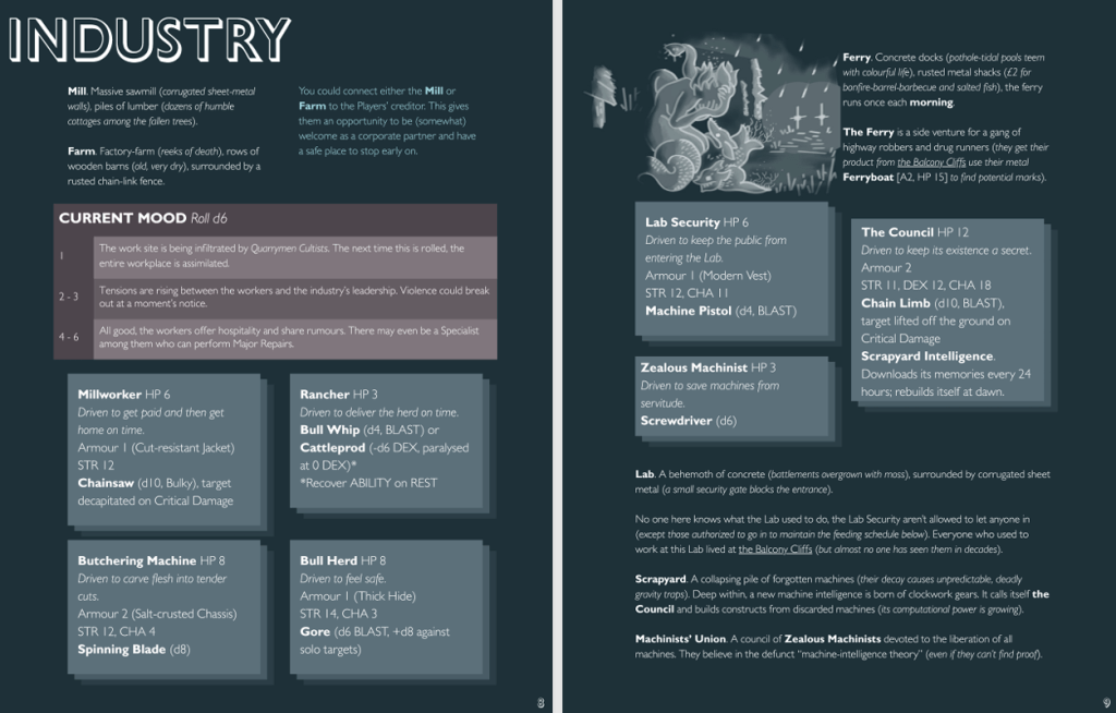 I’ve already written about how I would run one of the treasure sites (Lakeside Lodge) and the town of O’Lane, so for this last development log, I want to focus on one of the industries.
