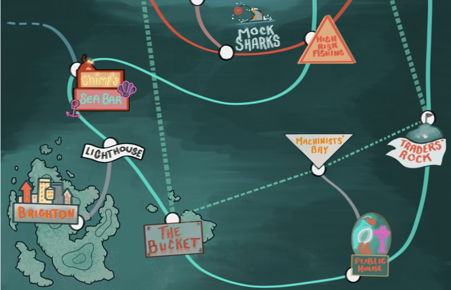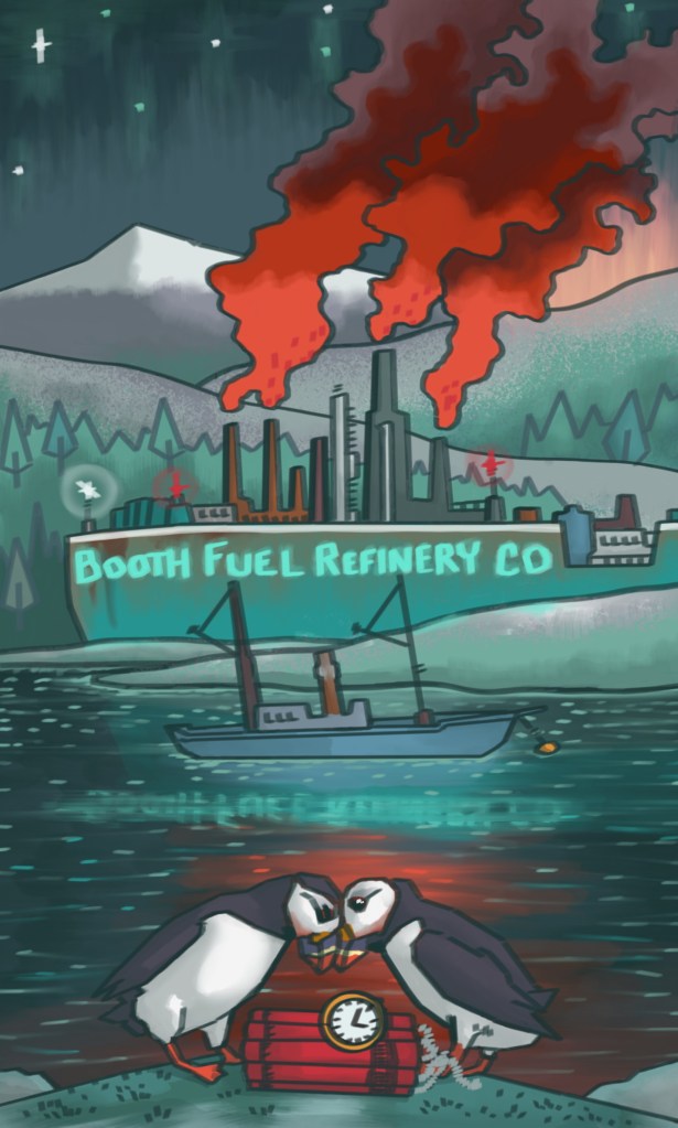 Public House. £6 for a Kelp Burger and a pint of sour ale. A colourful dive bar on a floating raft among speckled, rocky islands (the rocks and roof are home to a flock of puffins). The owner, Angel, is plotting the destruction of the Booth Fuel Refinery Company, and uses his bar as the secret headquarters for a militant crew of werepuffin spies.